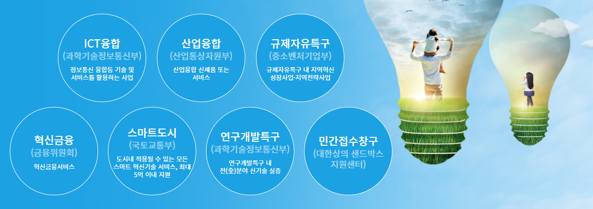 규제샌드박스 제도는 행정기관에서의 각종 절차와 관련하여 기존의 규제에도 불구하고 신기술의 시도가 가능하도록 일정 조건에서는 기존의 규제를 적용하지 않도록 하는 신산업 규제혁신 플랫폼 제도 입니다.