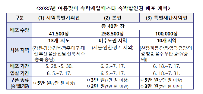 - 본편 (6. 2.~7. 17. 발급): 수도권(서울·경기·인천)을 제외한 비수도권 지역 숙박시설에 적용돼요. 7만 원 이상은 3만 원, 2만 원 이상 7만 원 미만은 2만 원 할인받을 수 있답니다.