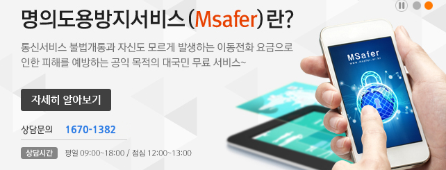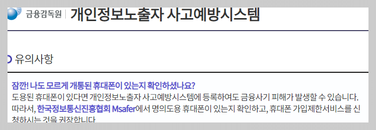 4) 한국정보통신진흥협회 명의도용방지서비스(www.msafer.or.kr)를 통해 휴대폰 명의 도용 여부를 확인하고, 필요시 신규 개통을 차단합니다.